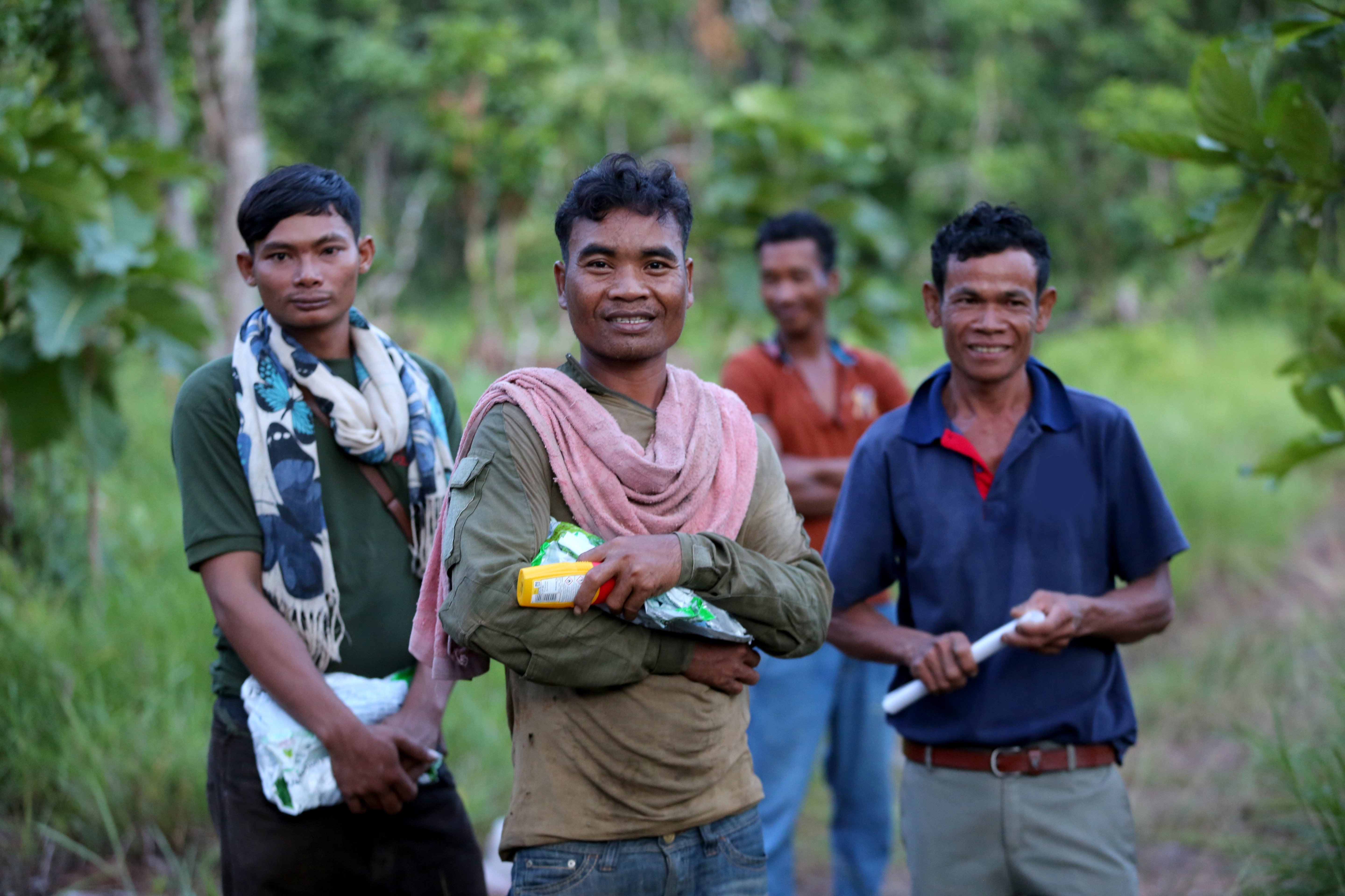 A group of men receive malaria prevention supplies including ASMQ (malaria medication) which is part of Cambodia’s aggressive approach.