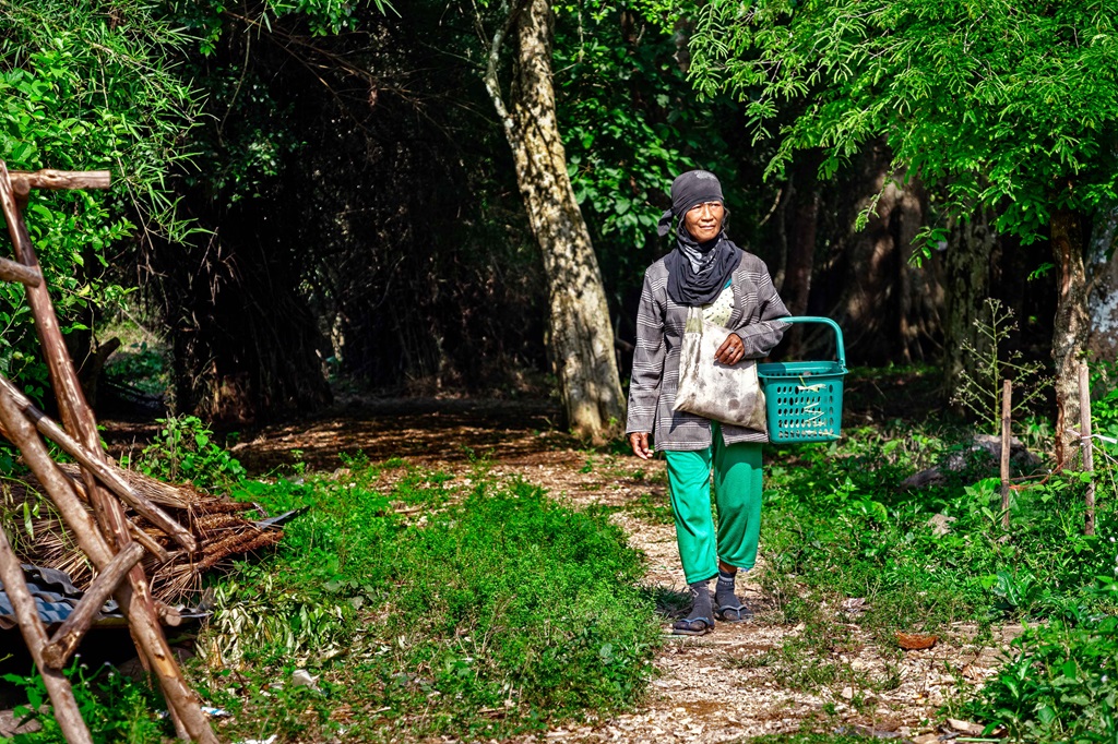 An elderly woman heads into a forest to collect mushrooms in Sangthong district, Lao People’s Democratic Republic.