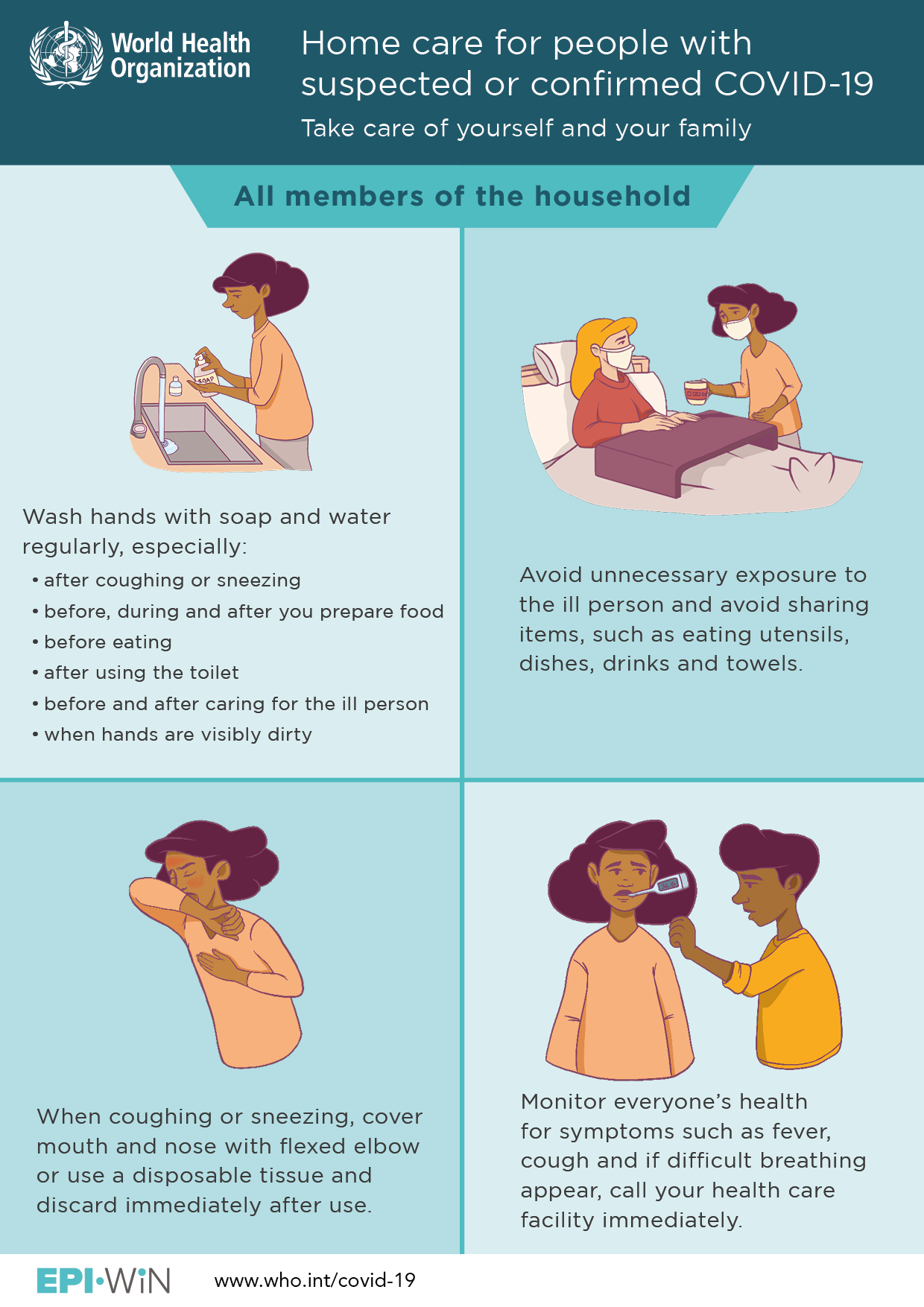 - If you live with others and home care for COVID-19 is advised by your health-care worker, other household members should follow available guidance on home care for patients with COVID-19 presenting with mild symptoms and management of their contacts (guidance here). See related flyers for people who are ill, for household members and for caregivers.