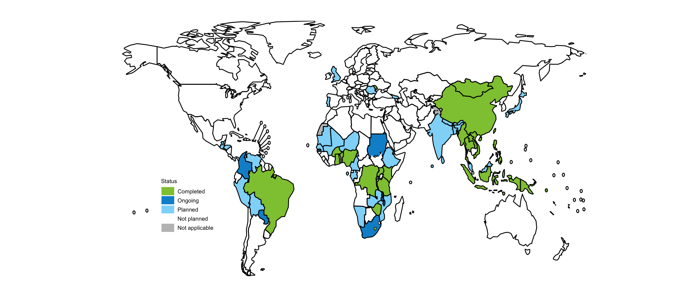 Since 2015, there has been substantial progress in the implementation and planning of national TB patient cost surveys (Fig. 6.2.1). By September 2021, 25 countries had completed a survey: Benin (2018), Brazil (2019), Burkina Faso (2020), China (2016), the Democratic Republic of the Congo (2019), El Salvador (2021), Fiji (2017), Ghana (2016), Indonesia (2020), Kenya (2017), Lao People’s Democratic Republic (2019), Lesotho (2019), Mongolia (2017), Myanmar (2015), Nigeria (2017), Papua New Guinea (2019), the Philippines (2016), Republic of Moldova (2016), Solomon Islands (2019), Thailand (2020), Timor-Leste (2017), Uganda (2018), the United Republic of Tanzania (2019), Viet Nam (2016) and Zimbabwe (2018).